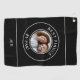 Creating your custom golf towel is a breeze with our user-friendly template. Simply upload your favourite photo and add any initials, name, or personalized message. You can even choose the text and background colours to match his preferences. The image and text are printed in white, accentuated by two circular white borders, providing a striking contrast against the solid black background.