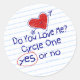 A fun round sticker reminiscent of those school days love notes that say, "do you love me?" then offer a choice of "yes" or "no" to circle and "Yes" is already circled!