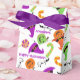 This is a fun Halloween favour box with candy, pumpkins and witch's hats on a white background. The favour box can be personalized by changing the name on the box and the text. It can be given at parties, or corporate events.