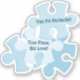 The Fun Jigsaw Puzzle Blue Birthday Motto Favor Sticker - This puzzle sticker features four overlapping blue jigsaw pieces. The center one shows a text placeholder with the motivational text: "Tiny Piece, Big Love!" and a second text with: You Fit Perfectly!" . All elements are customizable by color.