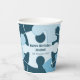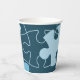 Fun Jigsaw Puzzle Kids Happy Birthday Name Blue Paper Cups, in 8 oz, feature a partial close-up of blue jigsaw puzzle pieces. In the center is a placeholder for the sample text "Happy Birthday, Jayden! and the party date!". Any unwanted text placeholder leave empty. All elements are color customizable.