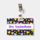This cheerful, fun and loving badge design features a pattern of heart shapes of various sizes and colored a variety of colors. It also features a customizable name in purple colored text within a white colored area. A badge like this could perhaps be worn by a teacher, educator, tutor or professor during the early weeks of a school year or a course. It might help the students learn and remember their teacher’s name. [~Z0000175]