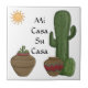 (En español, espanol, o lengua española.) The popular Spanish saying, "Mi casa, su casa" is "My house, your house" and is a commonly abbreviated version of "Mi casa es su casa." (That means "My house is your house.") Informal, inviting welcome to home or office decoration is cute and colourful. Tile background colour can be changed. American Southwest desert scene. Western graphics design in an Arizona or New Mexico style. Green saguaro (sahuaro) cactus. Native American or Mexican pottery. Clay pot with small cactus plants. Golden yellow sun. With a little help from my friends at www.scrappindoodles.com. From She Wolf Medicine.