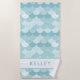 Get ready for the beach with this fun and modern style beach towel. This design features a cute mermaid pattern in shades of blue green and white. Personalize this towel for the beach or swimming with the name of your choice. The font and colour of the text are customizable.