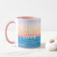 Fun Modern Cute Coffee is my love language Mug, with an ombre ocean sunset and the funny quote "Coffee is my love language". The shows the ombre sunset in pastel colours and has a pink inside and handle.