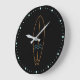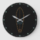 Modern and fun wall clock design features a black background with neon surfboard outline and dot style neon aqua clock face.