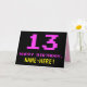 The front of this fun, geeky, and nerdy birthday themed greeting card design features a large pink number "13", along with the message "HAPPY BIRTHDAY," in pink, and a bold yellow custom recipient name. The text features an appearance inspired by that of vintage 8-bit style computer game and video game graphics from the 1970s and 1980s, and the background is coloured black. The inside features a customized birthday greeting message, or could perhaps be cleared and left blank if a message is to be written by hand instead. A silly personalized birthday card like this might be a fun way of celebrating somebody’s thirteenth birthday. [~Z0000478]