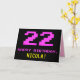 The front of this fun, nerdy, and geeky birthday-themed greeting card design features a large pink number "22", along with the message "HAPPY BIRTHDAY," in pink, and a bold yellow personalized recipient name. The text features a look inspired by that of classic 8-bit style computer game and video game graphics from the 1970s and 1980s, and the background is coloured black. The inside features a personalized birthday greeting message, or could perhaps be cleared and left blank if a message is to be written by hand instead. A silly personalized birthday card like this might be a fun way to send a message in celebration of somebody’s twenty second birthday. [~Z0000478]