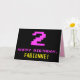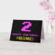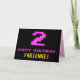 The front of this fun, geeky, and nerdy birthday-themed greeting card design features a large number "2" and the message "HAPPY BIRTHDAY," coloured pink, along with a bold yellow personalized recipient name. The text has an appearance inspired by that of vintage 8-bit style video game and computer game graphics from the 1970s and 1980s, and the background is coloured black. The inside has a customized birthday greeting message, or could perhaps be cleared and left blank if a message is to be written by hand instead. A silly customizable birthday card like this might be a fun way to send a message in celebration of somebody’s second birthday. [~Z0000478]