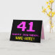 The front of this fun, geeky, and nerdy birthday-themed greeting card design features a large number "41" and the message "HAPPY BIRTHDAY," colored pink, along with a bold yellow editable recipient name. The text has a look inspired by that of classic 8-bit style computer/video game graphics from the 1970s and 1980s, and the background is colored black. The inside has a personalized birthday greeting message, or could perhaps be cleared and left blank if a message is to be written by hand instead. A silly personalized birthday card like this might be a fun way to send a message in celebration of somebody’s forty first birthday. [~Z0000478]