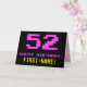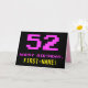 The front of this fun, nerdy, and geeky birthday greeting card design features a large number "52" and the message "HAPPY BIRTHDAY," coloured pink, along with a bold yellow personalized recipient name. The text has a look inspired by that of vintage 8-bit style video/computer game graphics from the 1970s and 1980s, and the background is coloured black. The inside has a custom birthday greeting message, or could perhaps be cleared and left blank if a message is to be written by hand instead. A silly customizable birthday card like this might be a fun way to acknowledge somebody’s fifty second birthday. [~Z0000478]