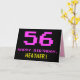 The front of this fun, geeky, and nerdy birthday-themed greeting card design features a large number "56" and the message "HAPPY BIRTHDAY," colored pink, along with a bold yellow customizable recipient name. The text has a look inspired by that of retro 8-bit style video/computer game graphics from the 1970s and 1980s, and the background is colored black. The inside features a customized birthday greeting message, or could perhaps be cleared and left blank if a message is to be written by hand instead. A silly customizable birthday card like this might be a fun way to send a message in celebration of somebody’s fifty-sixth birthday. [~Z0000478]