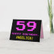 The front of this fun, geeky, and nerdy birthday themed greeting card design features a large pink number "59", along with the message "HAPPY BIRTHDAY," in pink, and a bold yellow custom recipient name. The text features an appearance inspired by that of retro 8-bit style video game and computer game graphics from the 1970s and 1980s, and the background is coloured black. The inside features a customizable birthday greeting message, or could perhaps be cleared and left blank if a message is to be written by hand instead. A silly personalized birthday card like this might be a fun way to celebrate somebody’s fifty ninth birthday. [~Z0000478]