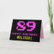The front of this fun, nerdy, and geeky birthday themed greeting card design features a large number "89" and the message "HAPPY BIRTHDAY," colored pink, along with a bold yellow editable recipient name. The text has an appearance inspired by that of classic 8-bit style computer game and video game graphics from the 1970s and 1980s, and the background is colored black. The inside features a personalized birthday greeting message, or could perhaps be cleared and left blank if a message is to be written by hand instead. A silly customizable birthday card like this might be a fun way of celebrating somebody’s eighty ninth birthday. [~Z0000478]