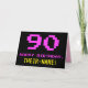 The front of this fun, nerdy, and geeky birthday-themed greeting card design features a large pink number "90", along with the message "HAPPY BIRTHDAY," in pink, and a bold yellow editable recipient name. The text features a look inspired by that of vintage 8-bit style computer game and video game graphics from the 1970s and 1980s, and the background is coloured black. The inside features a customizable birthday greeting message, or could perhaps be cleared and left blank if a message is to be written by hand instead. A silly birthday card like this might be a fun way to send birthday wishes to a woman or somebody else who is celebrating their ninetieth birthday. [~Z0000478]