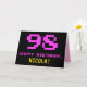The front of this fun, geeky, and nerdy birthday themed greeting card design features a large number "98" and the message "HAPPY BIRTHDAY," colored pink, along with a bold yellow custom recipient name. The text has a look inspired by that of classic 8-bit style video game and computer game graphics from the 1970s and 1980s, and the background is colored black. The inside has a customized birthday greeting message, or could perhaps be cleared and left blank if a message is to be written by hand instead. A silly personalized birthday card like this might be a fun way of celebrating somebody’s ninety eighth birthday. [~Z0000478]