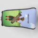 A fun cartoon design featuring a golfer in vintage attire standing in the rough looking towards the green and flag. The golfer is carrying a golf bag with golf clubs. Any name or initials can be entered to create a unique personalized golf gift for the keen golfer or golf fan
