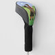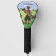 A fun cartoon design featuring a golfer in vintage attire standing in the rough looking towards the green and flag. The golfer is carrying a golf bag with golf clubs. Any name or initials can be entered to create a unique personalized golf gift for the keen golfer or golf fan