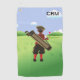 A fun cartoon design featuring a golfer in vintage attire standing in the rough looking towards the green and flag. The golfer is carrying a golf bag with golf clubs. Any name or initials can be entered to create a unique personalized golf gift for the keen golfer or golf fan