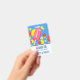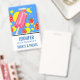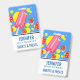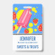 Name tag with a summery theme. Designed with pink popsicle and some red strawberries tumbling around the popsicle along with some yellow paint splashes. Blue background.