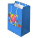 A gift bag with a summery theme. Designed with a pink popsicle and some red strawberries and yellow paint splashes. Blue background.