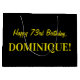One side of this fun and simple birthday-themed gift bag design features a large number "73" with a dark pink and light pink stripes pattern. The other side features the birthday greeting message "Happy 73rd Birthday," and an editable name, both in yellow coloured text. The background is coloured black. A gift bag like this might be used when wrapping presents or gifts being given to somebody who is celebrating their seventy third birthday. [~Z0000378]