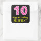 This cheerful birthday-themed square sticker design features a large number “10”, with a dark pink and light pink stripes pattern. It also features the message “Happy 10th Birthday,”, and an editable name. The background is coloured black. Fun, joyful, personalized stickers like this might be given as a birthday present, or used while wrapping gifts/presents, or perhaps used as birthday party decorations when celebrating somebody’s 10th birthday. [~Z0000578]