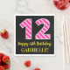 This fun birthday-themed paper napkin design features a large number "12" with a dark pink and light pink stripes pattern, along with the message "Happy 12th Birthday,", and a custom name. The background is coloured black. Fun, editable birthday themed paper napkins like this might be used at somebody’s 12th birthday celebration. [~Z0000380]