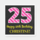 This fun birthday-themed paper napkin design features a large number "25", with a light pink and dark pink stripes pattern. It also features the message "Happy 25th Birthday,", and a customizable name. The background is coloured black. Birthday themed paper napkins like this might be used at a party celebrating somebody’s 25th birthday. [~Z0000380]