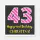 This fun birthday-themed paper napkin design features a large number "43" with a dark pink and light pink stripes pattern, along with the message "Happy 43rd Birthday,", and a customizable name. The background is coloured black. Birthday themed paper napkins like this might be used at a party celebrating somebody’s forty third birthday. [~Z0000380]