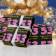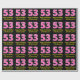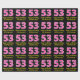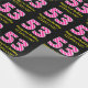 This fun birthday-themed wrapping paper design features a large number "53", with a light pink and dark pink stripes pattern. It also features the message "Happy 53rd Birthday,", and a personalized name. The background is coloured black. Birthday themed wrapping paper like this might be used when giving a gift or present in celebration of somebody’s fifty third birthday. [~Z0000376]