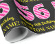 This fun birthday-themed wrapping paper design features a large number "56" with a dark pink and light pink stripes pattern, along with the message "Happy 56th Birthday,", and an editable name. The background is coloured black. Wrapping paper like this might be used when wrapping gifts being given to somebody in celebration of their fifty sixth birthday. [~Z0000376]