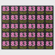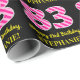 This fun birthday-themed wrapping paper design features a large number "83", with a dark pink and light pink stripes pattern. It also features the message "Happy 83rd Birthday,", and a personalized name. The background is coloured black. Birthday themed wrapping paper like this might be used when giving a gift or present in celebration of somebody’s eighty third birthday. [~Z0000376]