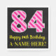 This fun birthday-themed paper napkin design features a large number "84" with a light pink and dark pink stripes pattern, along with the message "Happy 84th Birthday,", and a personalized name. The background is coloured black. Fun, editable paper napkins like this might be used at a birthday celebration being held in honour of somebody’s 84th birthday. [~Z0000380]