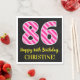 This fun birthday-themed paper napkin design features a large number "86", with a light pink and dark pink stripes pattern. It also features the message "Happy 86th Birthday,", and a customizable name. The background is coloured black. Birthday themed paper napkins like this might be fun to use at a party being held to celebrate somebody’s 86th birthday. [~Z0000380]