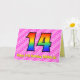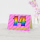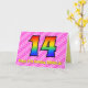 This happy and fun 14th birthday greeting card design has a front featuring a large number "14" having a colorful pattern inspired by the look of a rainbow spectrum, on a dark pink and light pink heart shapes stripes pattern background. The front also features the message "Happy 14th Birthday,", followed by a personalized recipient name. The inside features an editable birthday greeting message, or could perhaps be cleared and left blank if a message is to be written by hand instead. A personalized birthday card like this might be a fun and happy way of sending birthday wishes to somebody who is celebrating their fourteenth birthday. [~Z0000418]