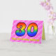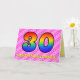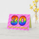 This upbeat and fun 30th birthday greeting card design has a front featuring a large number "30" having a colourful pattern inspired by the look of a rainbow spectrum, on a cheerful dark pink and light pink heart shapes stripes pattern background. The front also features the message "Happy 30th Birthday,", followed by a personalized recipient name. The inside features a customizable birthday greeting message, or could perhaps be cleared and left blank if a message is to be written by hand instead. A personalized birthday card like this might be a fun and happy way of acknowledging somebody’s thirtieth birthday. [~Z0000418]