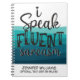 Fun humourous notebook featuring the caption I speak fluent sarcasm in black modern typography on a white background with decorative blue waves.