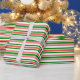 This wrapping paper design features a Christmas inspired striped pattern having colours like red, white, and green. Wrapping paper like this might be used when preparing gifts or presents being given to celebrate a birthday, a wedding, an anniversary, or some other event.