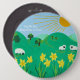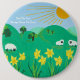 The original and cute illustration on this original and fun button is a painting in a "nieve" sort of style, it's bright and colourful. The picture shows some white and fluffy black faced sheep grazing behind daffodils on the hillside as the large sun shines down upon them, the sky is a pale blue. In the background you can see small leaf covered trees with red apples on them. This unique button has the fun slogan "May the sun always shine on you!" and is suitable for people of all ages.