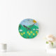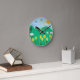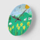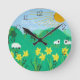 The original and cute sheep illustration on this original and fun cclock is a painting in a "nieve" sort of style, it's bright and colourful. The picture shows some white and fluffy black faced sheep grazing behind daffodils on the hillside as the large sun shines down upon them. In the background you can see small leaf covered trees with red apples on them. This unique clock has the fun slogan "May the sun always shine on Ewe!" and is suitable for people of all ages.