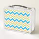 A fun school bus with a green, white, and orange chevron background, give your child their own customizable lunchbox.  With a place to insert their name on the school bus window, personalize yours today!