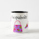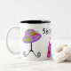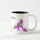 Whimsical mug, with fun graphics of a pink, lavender, and green hat, purse, and high heels. Black text at the top reads Shopaholic. Great cup for every day use at the home or office.
