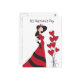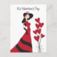 Girl in a red dress, black hat and long black gloves and seven heart ballons float by her.