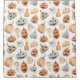This design features a charming watercolor pattern of pumpkins and jack-o'-lanterns in a soft, muted colour palette. The design includes various pumpkin shapes and sizes, painted in gentle shades of orange, cream, and grey. Each jack-o'-lantern has a unique carved face, ranging from happy and friendly to slightly spooky, adding character and variety to the pattern. The pumpkins are arranged on a clean, white background, allowing the delicate watercolor textures to stand out. The overall design is both festive and adorable, perfect for capturing the whimsical spirit of Halloween in a cozy, artistic way.