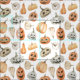 This design features a charming watercolor pattern of pumpkins and jack-o'-lanterns in a soft, muted colour palette. The design includes various pumpkin shapes and sizes, painted in gentle shades of orange, cream, and grey. Each jack-o'-lantern has a unique carved face, ranging from happy and friendly to slightly spooky, adding character and variety to the pattern. The pumpkins are arranged on a clean, white background, allowing the delicate watercolor textures to stand out. The overall design is both festive and adorable, perfect for capturing the whimsical spirit of Halloween in a cozy, artistic way.