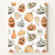 This design features a charming watercolor pattern of pumpkins and jack-o'-lanterns in a soft, muted colour palette. The design includes various pumpkin shapes and sizes, painted in gentle shades of orange, cream, and grey. Each jack-o'-lantern has a unique carved face, ranging from happy and friendly to slightly spooky, adding character and variety to the pattern. The pumpkins are arranged on a clean, white background, allowing the delicate watercolor textures to stand out. The overall design is both festive and adorable, perfect for capturing the whimsical spirit of Halloween in a cozy, artistic way.