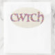 Mail a Welsh 'cwtch' to your loved ones! A sheet of oval stickers with the Welsh word 'cwtch', meaning 'cuddle' or 'hug' in a Celtic script, filled with a pretty ditzy floral pattern on a linen-effect background.