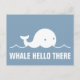Cool fun pun design words saying Whale Hello There and with a simple illustration of a cute white whale on a pastel blue Postcard. The background colour is customizable and can be changed to any other colour.