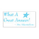 This motivating rubber stamp design features the message "What A Great Answer!" and a personalized teacher's, educator's or tutor's name. It also features a decorative star shape. It could be used by a teacher, educator, or tutor when grading student work, to acknowledge that a student has done an exceptional job.